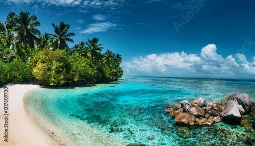 Fototapeta premium oculto en el corazón de una isla tropical, donde el verde follaje se entrelaza con las aguas cristalinas, creando una unión armoniosa entre la tierra y el mar, evocando una sensación de paraíso,