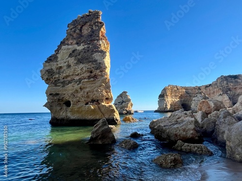 © catrina, Fototapeta premium Oddly shaped jagged rock formations and cliffs at Lagoa Beach, Faro District, Southern Portugal.