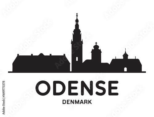 © Nargis, Obraz premium Odense skyline horizontal banner. Odense, Denmark. Vector template for your design. Vector black silhouette. with white background