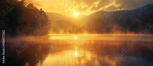Naklejka premium of a golden sunrise over a misty lake, surrounded by mountains and a serene forest backdrop