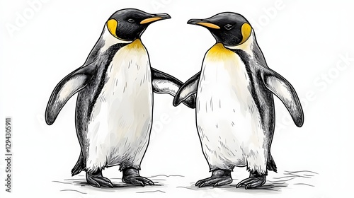 © Marketplace, Fototapeta premium of a pair of penguins waddling together across an icy Arctic landscape depicted in a whimsical fine line engraved style The charming black and white seabirds are shown in a playful natural moment