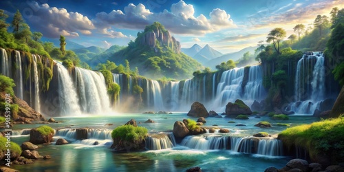 Fototapeta premium of a stunning fantasy river landscape with cascading waterfalls, fantasy,...