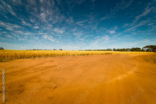 Obraz premium Off-road in the Golden wheat field, ,blue sky .