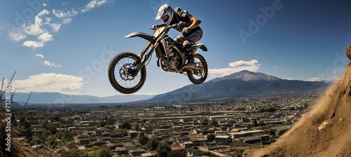 © Ilja, Naklejka premium Off road motorcycle mid air jump over canyon with blue sky background