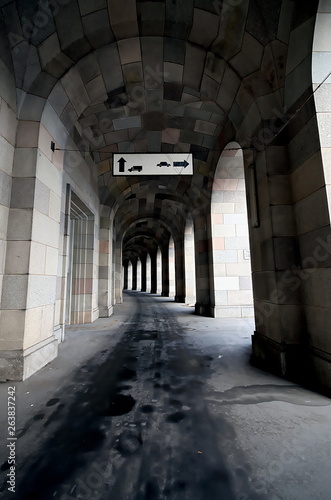 © Frank, Fototapeta premium Offener Arkadengang in leerem backsteinbau