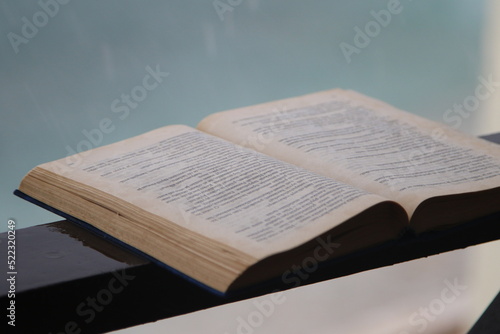 © Peter, Fototapeta premium Offenes Buch auf Holzgeländer