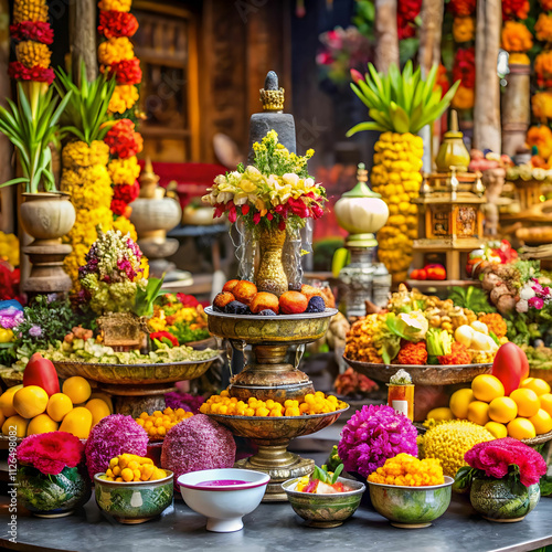 Fototapeta premium Offerings of flowers and fruits placed at an altar