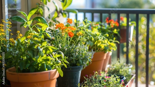 Fototapeta premium Office balcony garden with a mix of potted flowers and herbs, providing a...