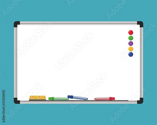 Obraz premium Office board. Concept for school or business presentations. Empty board with magnets and markers. White school board. Vector illustration.