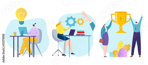 © Vectorwonderland, Fototapeta premium Office clerk colleague character sitting workplace, teamwork golden cup and light bulb idea flat vector illustration, isolated on white.