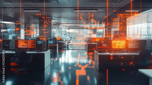 Fototapeta premium Office environment with high-tech computers displaying data analytics for...