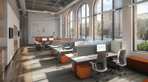 Fototapeta premium Office of the future with customizable workstations, featuring a tech-savvy, personalized design, in a modern urban setting, emphasizing individual preferences.