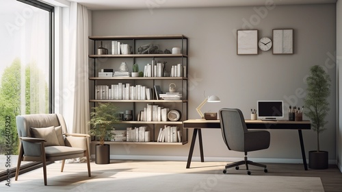 Fototapeta premium Office room at home, modern interior in Scandinavian style, desk, chair, shelf with books