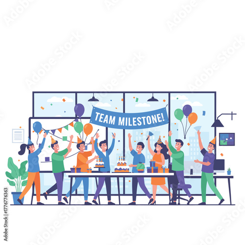 Fototapeta premium Office scene of people decorating the workplace, teamwork, celebration