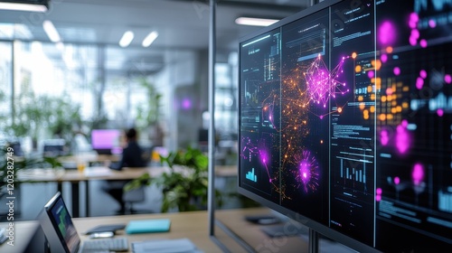 Obraz premium Office screen displays data; network visualization.