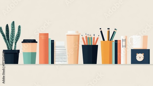 © Almahyra, Obraz premium Office supplies, books, and plant on shelf.