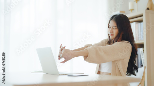 © Monster Ztudio, Fototapeta premium Office syndrome concept. Young asian woman feeling pain in neck and shoulder after working on computer laptop for a long time. She stretches to relax her muscles