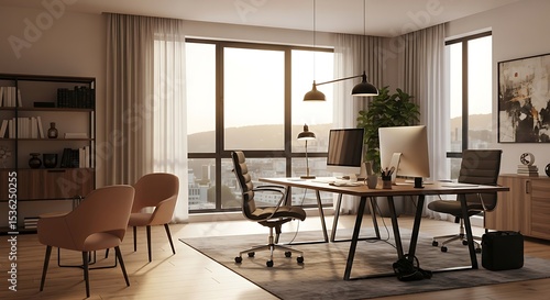 © dawnverse, Fototapeta premium Office with Desk Chair Computer Lamp Art Bookshelf Curtain