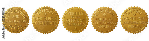 Fototapeta premium Official North Pole gold seal set — Santa Claus certified Christmas stamps...