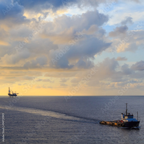 Fototapeta premium Offshore jack up drilling rig and supply boat