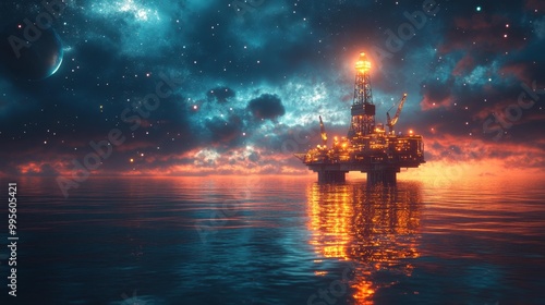 © Tatiana Vagizova, Obraz premium Offshore Oil Rig at Twilight Generative AI