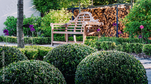Fototapeta premium Ogród nowoczesny z ławeczką i bukszpanem