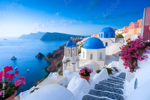 Fototapeta premium Oia santorini greece, charming white and blue church overlooking aegean sea