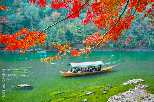 © 7maru, Obraz premium Oigawa i łodzie mieszkalne w Arashiyama, Kioto w sezonie jesiennych liści