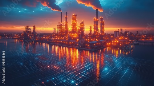 Obraz premium Oil and gas industry facility depicted in a digital format, with illuminated...