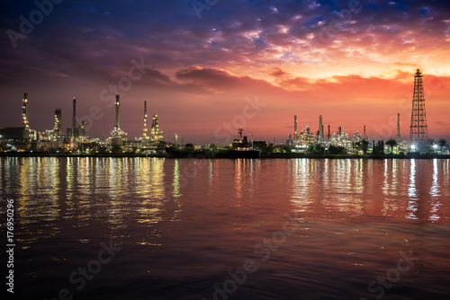 Naklejka premium Oil and gas industry - refinery at Sunrise - factory - petrochemical plant with reflection over the river