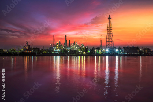 Naklejka premium Oil and gas industry - refinery at Sunrise - factory - petrochemical plant with reflection over the river