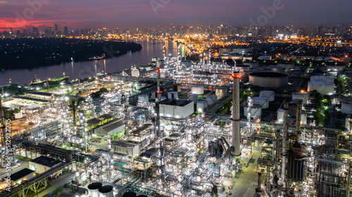 © Darunrat, Obraz premium Oil and gas refinery plant form industry zone at night, Aerial view oil and gas Industrial petrochemical fuel power and energy.