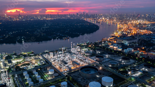 © Darunrat, Obraz premium Oil and gas refinery plant form industry zone at night, Aerial view oil and gas Industrial petrochemical fuel power and energy.