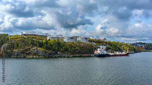 © Igor Groshev, Fototapeta premium Oil/Chemical tanker sit berthed at a shore terminal with a oil product storage tanks above on Stockholm archipelago coast.