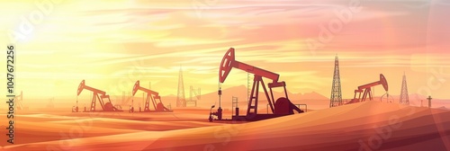 Fototapeta premium Oil drilling derricks work diligently in a desert oilfield as sunlight casts...