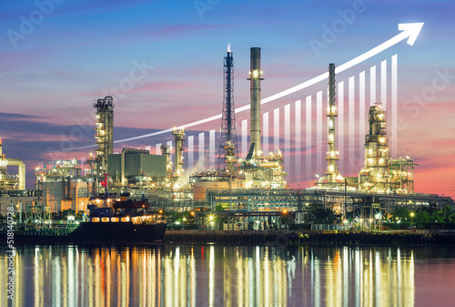 © DifferR, Naklejka premium Oil gas refinery plant or petrochemical plant. Include arrow, graph or bar chart. Increase trend or growth of production, market price, demand, supply. Concept of business, industry, fuel, energy.