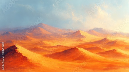 Naklejka premium Oil ink art of a desert landscape with rolling sand dunes using a warm color palette of oranges and yellows positioned from a low-angle to create a sense of vastness