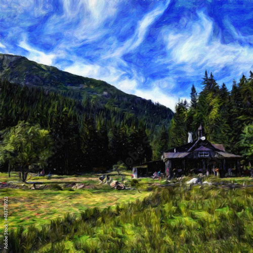 © Halina, Fototapeta premium Oil paint on canvas wall art. Beauty landscape nature scene. Large size print. Touristic place. Vacation scene drawing. Beautiful view.