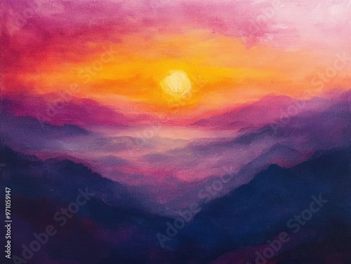 © Rizvan, Fototapeta premium Oil painting capturing a vivid sunset surrounded by layers of mist