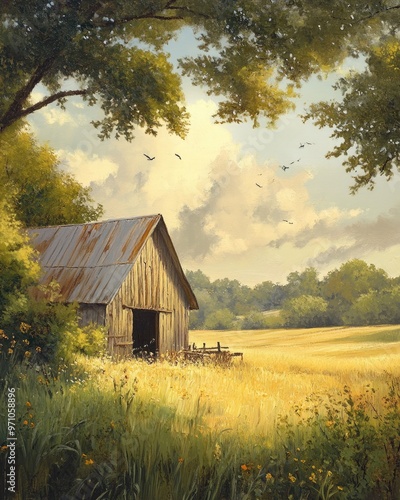 © Rizvan, Obraz premium Oil painting depicting a rural farm scene with fields and a rustic structure in a serene setting