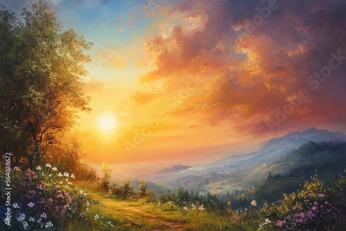 © Rizvan, Obraz premium Oil painting depicting a stunning sunset with a picturesque landscape