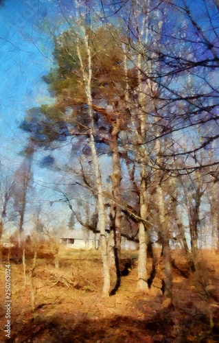 © AnnArts, Fototapeta premium Oil painting nature landscape contemporary stock wall art print for canvas or paper, or stationery. Hand drawing by brush original nature artwork. Village scene in spring or summer. Modern poster.