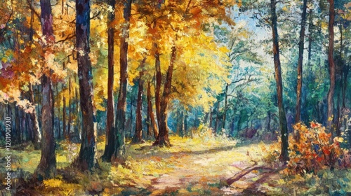 © Rapit, Obraz premium Oil painting of an autumn forest with yellow and green foliage and a trail of sunshine