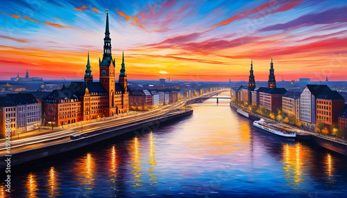 © Antonio Giordano, Naklejka premium oil painting on canvas, Hamburg City at sunset. Germany.