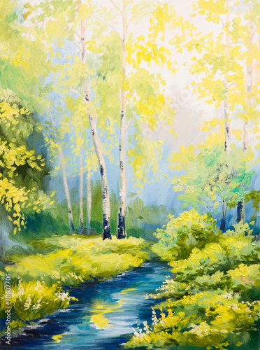 Fototapeta premium oil painting - spring landscape, river in the forest, colorful w