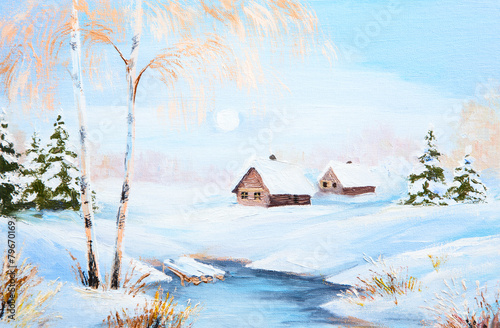 © Fresh Stock, Fototapeta premium oil painting winter landscape, frozen river in the forest, color