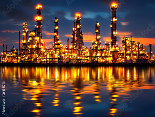 © StudioX, Fototapeta premium Oil Refinery at Dusk Reflected in Water