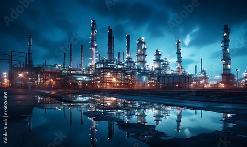 © MahmudulHassan, Naklejka premium Oil refinery at night with reflection in water.