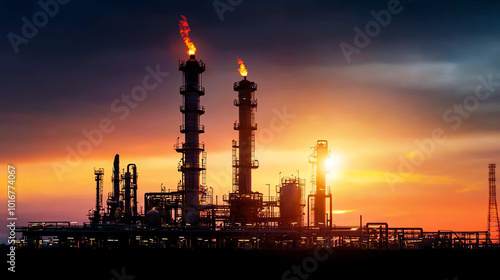 © Jiraphat.N, Fototapeta premium Oil refinery at sunset