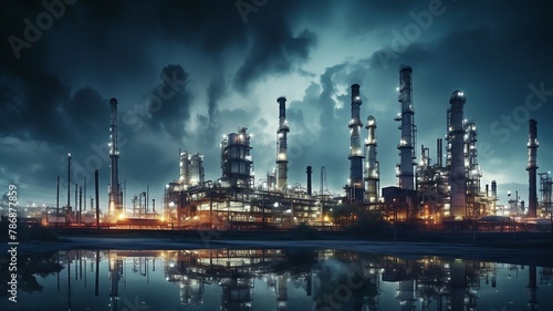 © MahmudulHassan, Naklejka premium oil refinery field at night with blue sky and white clouds.